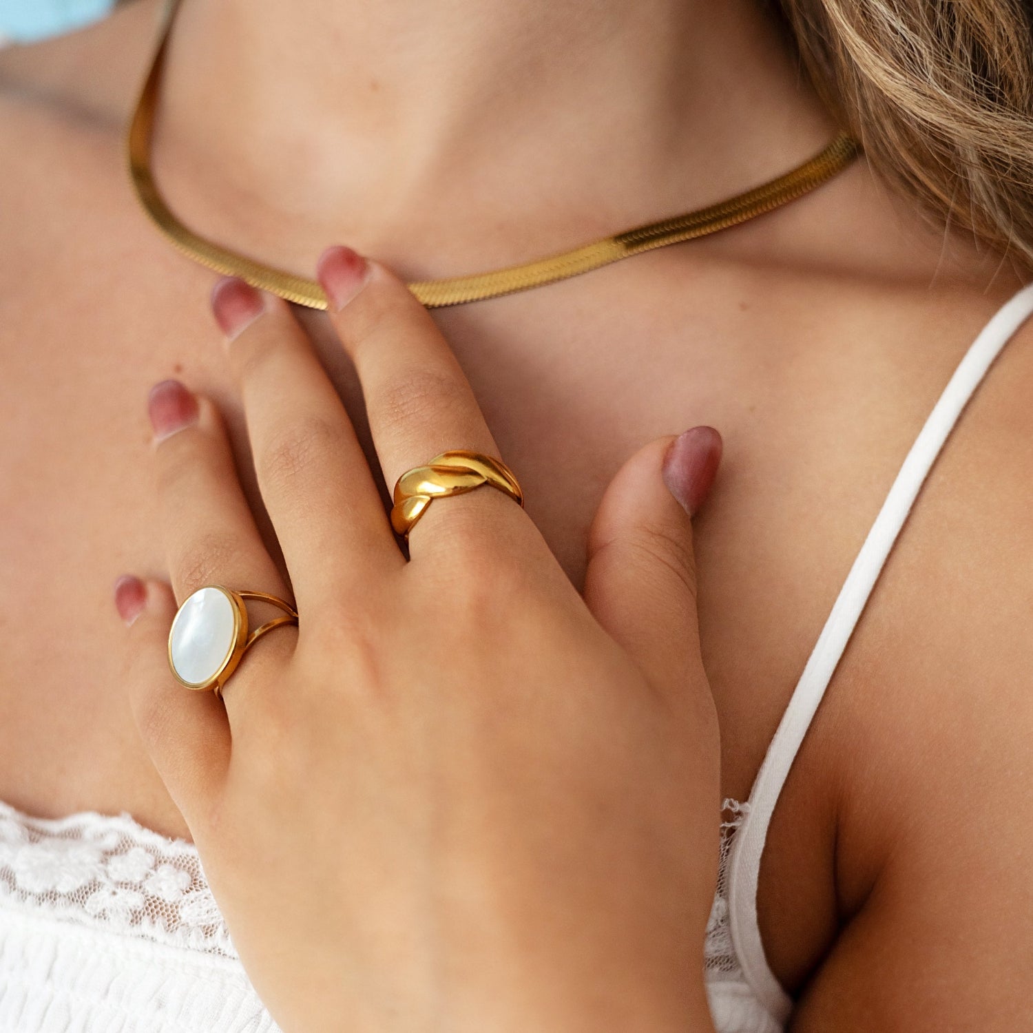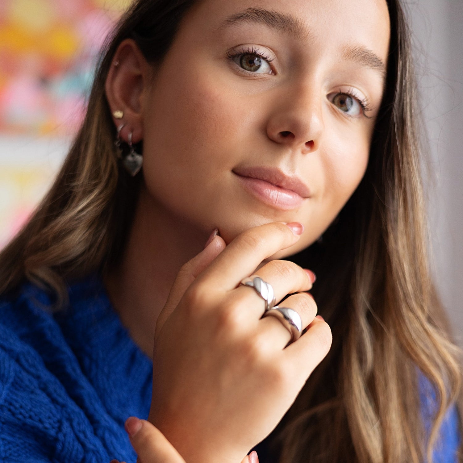 Son fini lustré et sa forme entrelacée ajoutent une touche chic et intemporelle à ton look.