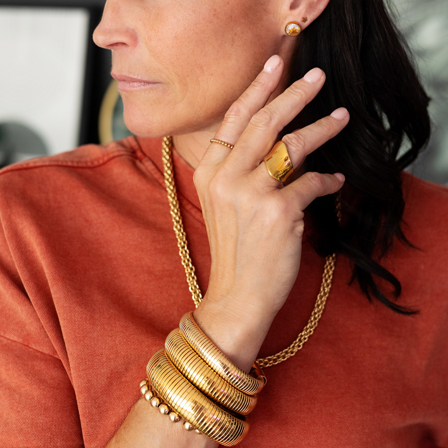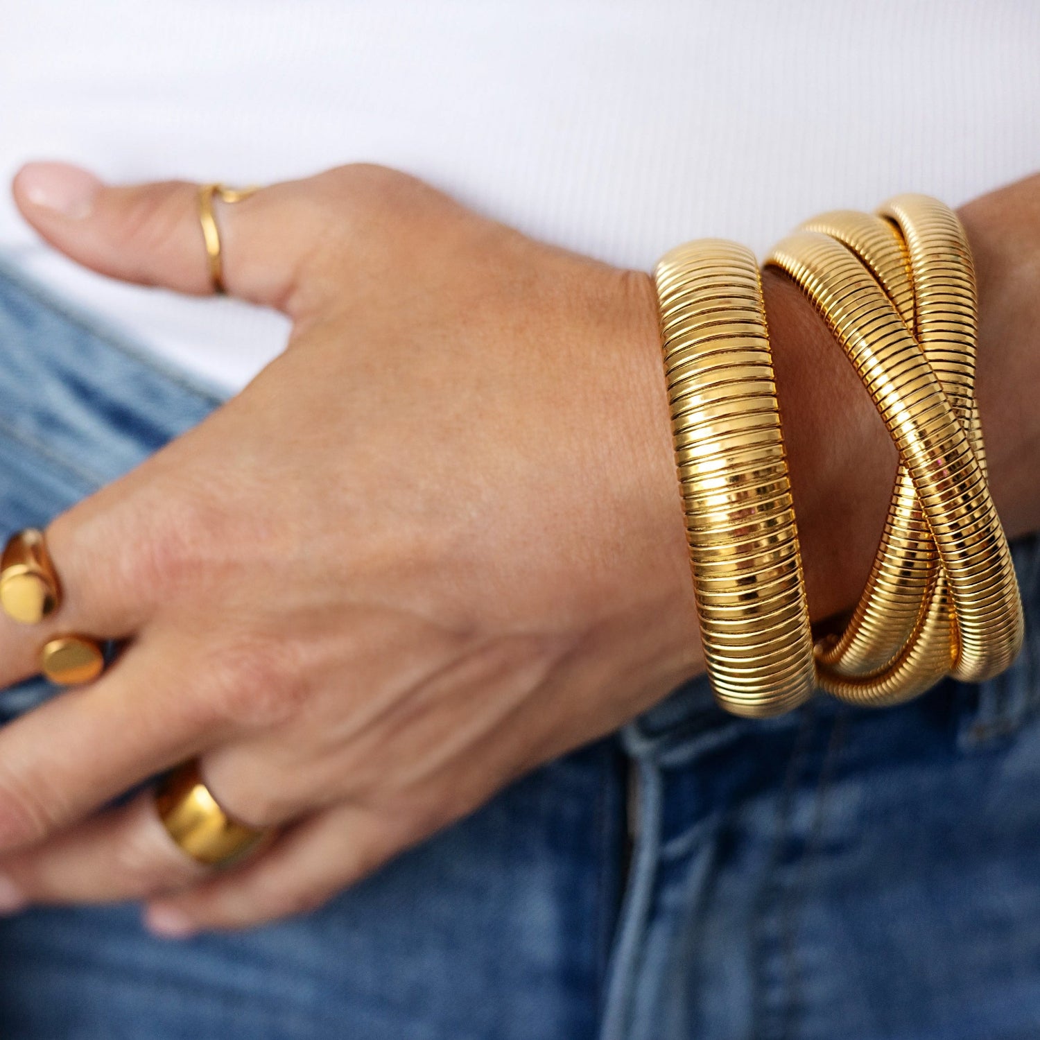 Minimaliste et moderne, le bracelet Gege épouse naturellement le poignet grâce à sa forme extensible fluide et brillante.